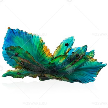 Maison Daumдополняет пышную коллекцию Fleur de Paon величественным центральным элементом и двумя изящными флаконами для духов. Даум использовал свои архивы, чтобы создать через 100 лет после коллекции Plume de Paon необычную коллекцию, которая перенесет нас в самое сердце джунглей Индо-Тихоокеанского региона, где большие экзотические листья смешиваются с исключительными перьями зеленого павлина. Оттенки синего, зеленого и янтарного, яркие и насыщенные, подчеркнутые блестящими черными штрихами, усиливают безупречную скульптурную работу мастеров мануфактуры.