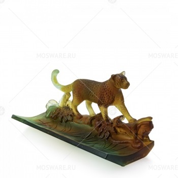 Янтарно-зеленая подставка из серии Leopard Tropical изображает роскошного представителя семейства кошачьих. От застывшей в хрустале фигуры словно исходит мягкий солнечный свет. Такого эффекта позволил добиться старинный метод литья из хрустальной пасты pate de verre. Выразительная фактура изделия точно передает пятнистую шкуру леопарда и прожилки на листьях под его лапами.