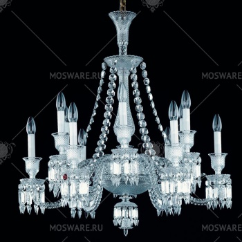 Люстра Баккара сделана из чистого хрусталя с 24-я лампами. Нержавеющая сталь ее основания имеет полированный и сильный эффект зеркала в сочетании с каплями прозрачного кристалла, стреловидной призмой из прозрачного кристалла и одного красного Baccarat кристалла.