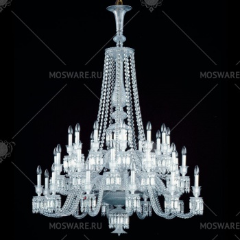 Люстра Баккара сделана из чистого хрусталя с 36-ю лампами. Нержавеющая сталь ее основания имеет полированный и сильный эффект зеркала в сочетании с каплями прозрачного кристалла, стреловидной призмой из прозрачного кристалла и одного красного Baccarat кристалла.