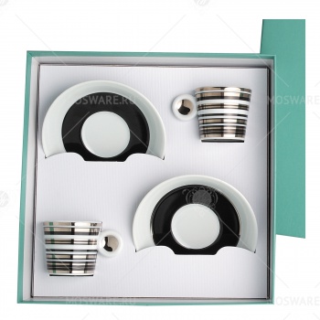 Набор из двух чашек с блюдцами, благодаря своей форме и резкости ребер, сохраняет тепло кофе. Он станет идеальным подарком для завершения коллекции.