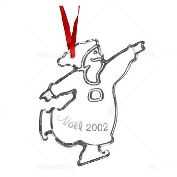 Скульптура Баккара Ёлочная игрушка "2002" сделана из чистого хрусталя в виде бегущего на коньках Деда Мороза, висящего на красной ленте.