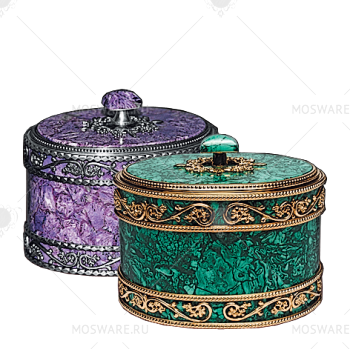 Шкатулка «Овал». Бронза, золочение, малахит; серебрение, чароит.
