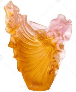 Ваза из коллекции Rose Royale, вдохновленной садом Марии Антуанетты, демонстрирует удивительные возможности фирменного материала Daum. Модель из шелковистого на ощупь хрусталя напоминает задрапированную ткань, которую скрепили пышными бутонами цветов. Насыщенно-янтарный в основании, оттенок постепенно светлеет и становится нежно-розовым на полупрозрачных краях. В лимитированном выпуске — 225 изделий.